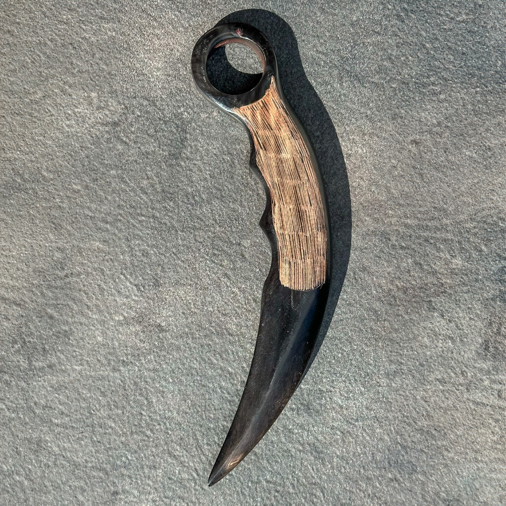 Dies ist ein Kerambit aus Büffelhorn mit einem per Hand eingegeritzten Bambusmatten-Design.