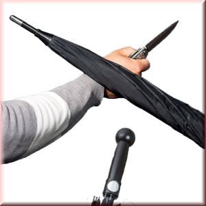 Es handelt sich um einen voll funktionsfähigen, eleganten Regenschirm mit automatischem Öffnungsmechanismus, der zuverlässig vor Wind und Wetter schützt. Der Stab des Regenschirms besteht aus einem speziellen Fiberglas und ist daher nahezu bruchsicher, unabhängig der jeweiligen Verwendung. Im Notfall kann er als Verteidigungshilfsmittel eingesetzt werden. Dieser Regenschirm unterliegt als gewöhnlicher Alltagsgegenstand keinerlei Vorschriften und kann ohne Aufsehen zu erregen überall getragen werden. Angesichts der immer rigideren Gesetzeslage und der Witterung ist er für europäische Verhältnisse ideal für den Selbstschutz.